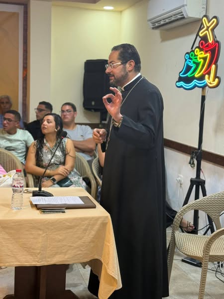 وبدأ الأب المطران لقائه بتعريف الغضب، ثم تناول أسبابه، وكيفيه تحويله إلى نعمة، مستخدمًا أمثلة كتابية، بدايةً مع آدم، ثم قايين وهابيل، وختامًا مع يسوع، وطرده للباعة من الهيكل.