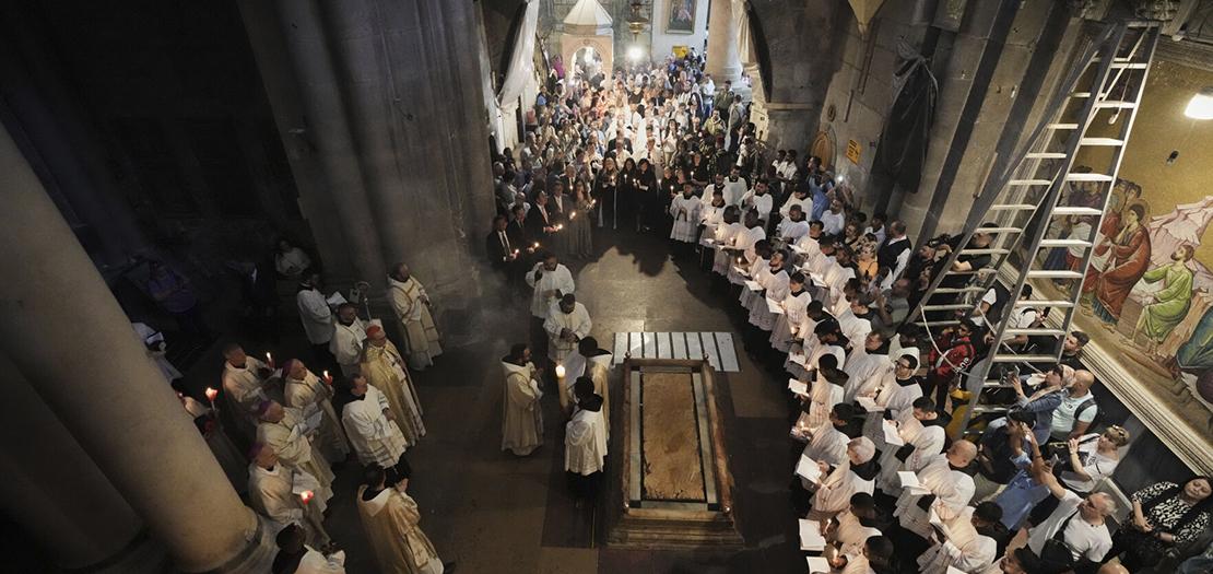 ها نحن نبلغ هذا العام أيضًا هذا المكان المقدّس، عند قبر المسيح الفارغ، لنحيي معًا ختام أسبوع الآلام، الذي يشكّل جوهر حياة الكنيسة وركيزة إيماننا. فهو يقيننا الثابت والأساس الذي يقوم عليه وجودنا: المسيح قام! ولا يسعنا إلا أن نتساءل عن معنى هذا الاحتفال وهذا اليوم، في السياق التاريخي المأساوي الذي نعيشه. ماذا يعني اليوم، لكنيسة القدس أن تلتقي القائم من بين الأموات وتشهد له؟
