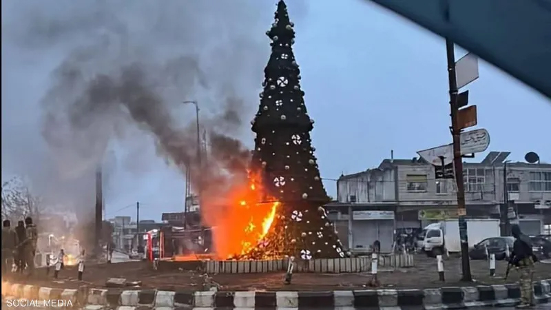 وقال المرصد السوري لحقوق الإنسان إن مسلحين ملثمين أضرموا النار في شجرة الميلاد، ومنعوا المواطنين من الاقتراب تحت تهديد السلاح.
