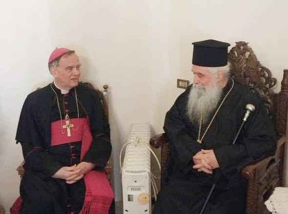زار، الأربعاء، سيادة رئيس الأساقفة نيقولاس هنري، السفير البابوي بمصر، سيادة المتروبوليت سيميون بابادوبولوس، رئيس أساقفة سيناء وفاران ورايثو، ورئيس دير القديسة كاترين المستقل المقدس، بجبل سيناء للروم الأرثوذكس، في زيارة تهدف إلى تقديم التهنئة الرسمية، والتعارف بين الطرفين.