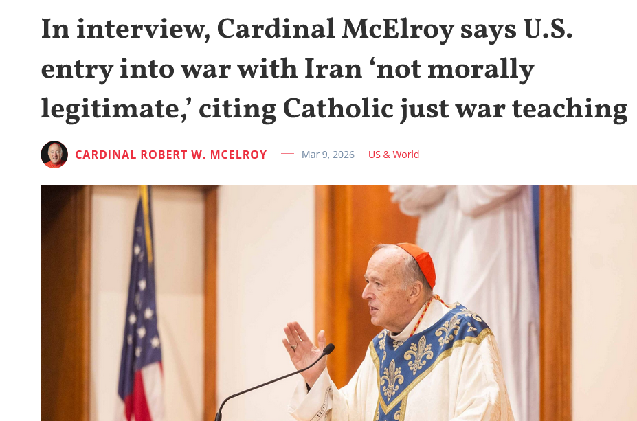 رأى رئيس أساقفة واشنطن، الكاردينال روبرت دبليو ماكلروي، أن قرار الولايات المتحدة بدخول الحرب مع إيران “ليس مشروعاً من الناحية الأخلاقية”. وفي مقابلة مع مجلة (كاثوليك ستاندرد)، الصادرة عن أبرشية واشنطن الكاثوليكية، قال الكاردينال: إنه “في هذا الوقت، لا يفي قرار الولايات المتحدة بإعلان الحرب على إيران بمعايير الحرب العادلة، وهو شرط ضروري لحرب مشروعة أخلاقياً”.