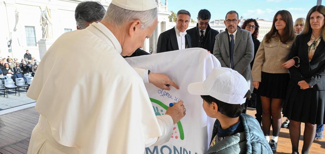 خلال المقابلة العامة، الأربعاء، بارك البابا لاوُن ووقّع على علم يحمل الشعار الرسمي لليوم العالمي للأطفال لعام 2026. وقال البابا، أثناء تحيته للحجاج الناطقين بالإيطالية: “أفكاري تتوجه إلى الأطفال، الذين سأكون سعيدًا بلقائهم في اليوم المُخصّص لهم، والمقرر عقده من 25 إلى 27 سبتمبر 2026”.