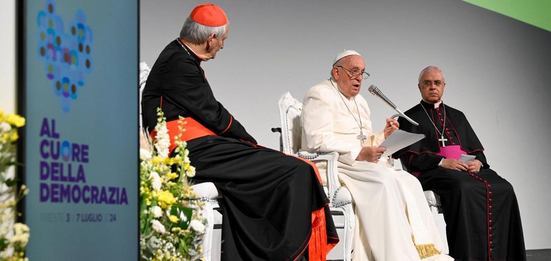 ثم ذكَّر الأب الأقدس بكلمات الطوباوي جوزيبي تونيولو الذي أسس الأسابيع الاجتماعية بسنة 1907 حين قال إن بالإمكان تعريف الديمقراطية بأنها ذلك النظام المدني الذي تتعاون فيه كل القوى الاجتماعية والقانونية والاقتصادية بكل متناسب من أجل الخير العام مساهِمة في نتيجة هي في المقام الأول لصالح الطبقات السفلى. وواصل البابا فرنسيس انه من الواضح في ضوء هذا التعريف أن الديمقراطية في عالم اليوم لا تتمتع بصحة جيدة، وهذا أمر يهمنا ويثير قلقنا، قال البابا، وذلك لأن على المحك هناك خير الإنسان، وما من شيء إنساني حق إلا وله صداه في قلوبنا كمسيحيين، أضاف الأب الأقدس مستشهدا بكلمات الوثيقة المجمعية الدستور الرعائي في الكنيسة في عالم اليوم “فرح ورجاء”.