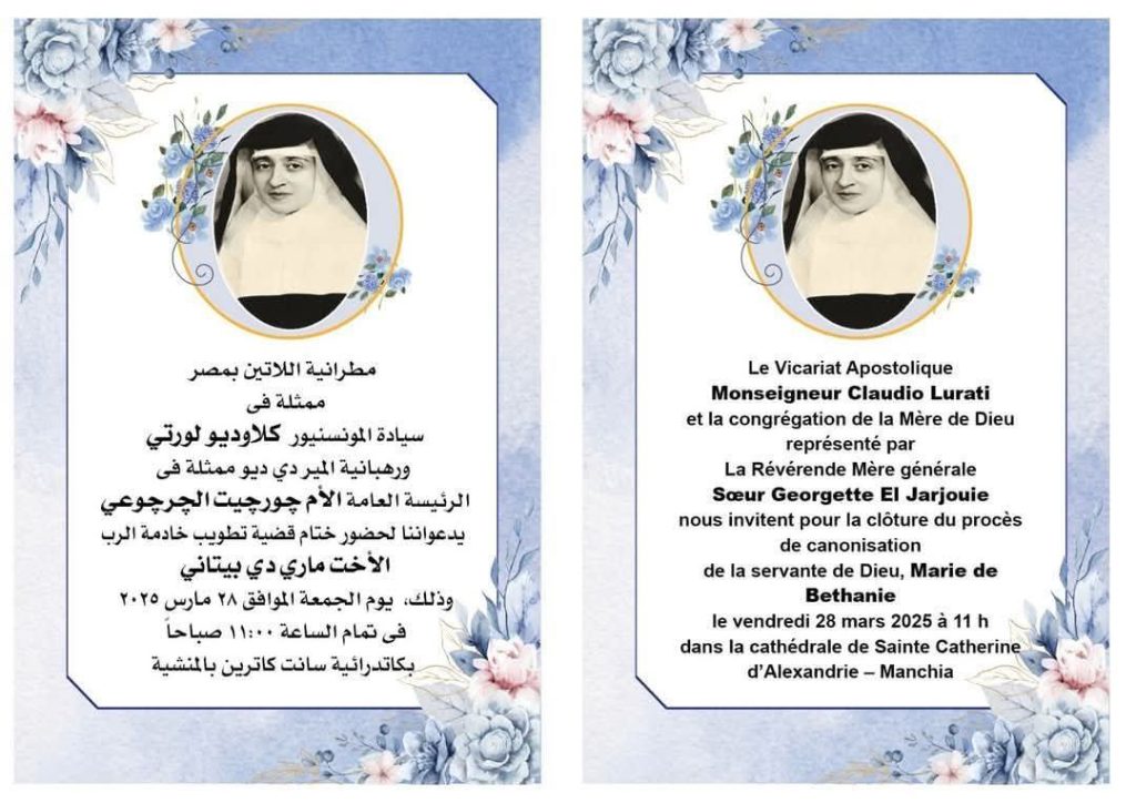 من جانبها دعت مطرانية اللاتين بمصر برئاسة المونسيور كلاوديو لوراتي، ورهبانية المير دي ديو ممثلة في الرئيسة العامة الأم جورجيت الجرجوعي، لحضور حفل التطويب، في تمام الحادية عشر صباح الجمعة الموافق 28 مارس الجاري.