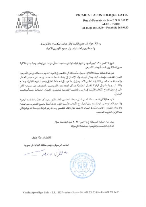 رسالة رعوية من النيابة الرسولية لطائفة اللاتين في سوريا