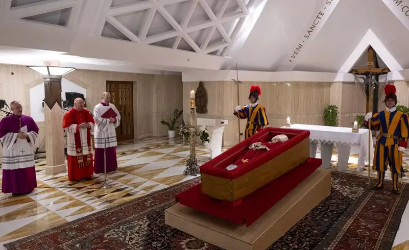 نشر الفاتيكان صباح اليوم الثلاثاء الصور الأولى للبابا فرنسيس مسجّى في نعشه ومحاطا بعنصرين من الحرس السويسري في كنيسة بيت القدّيسة مارتا، حيث كان يقيم.