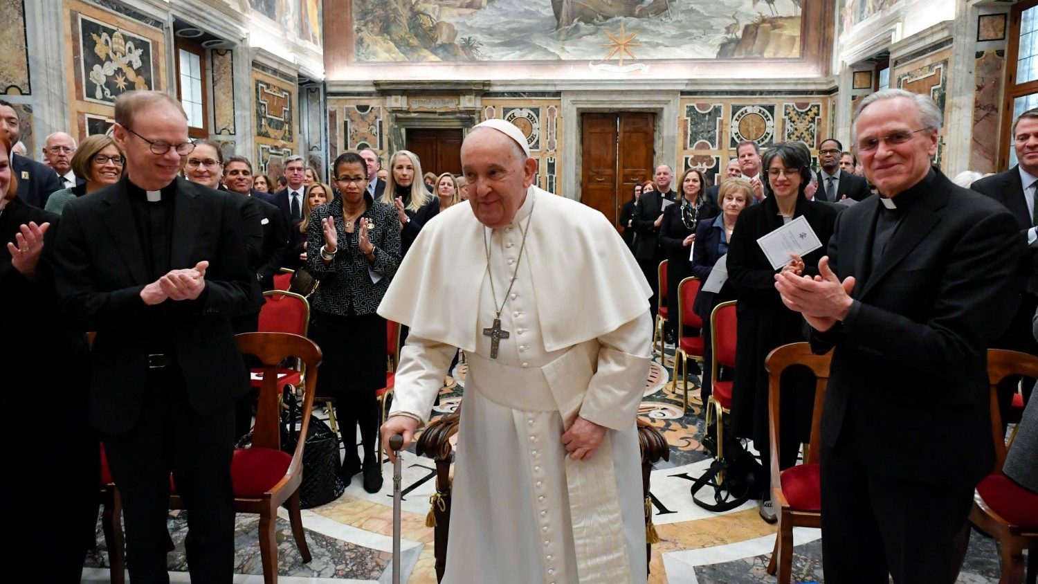 استهل الحبر الأعظم خطابه مرحباً بضيوفه، خاصا بالذكر رئيس المعهد الأب أنريدا كاتّانيو، وقال إن المؤسسة تحتفل بالذكرى السنوية الخامسة والعشرين بعد الأربعمائة لتأسيسها، إذ أبصرت النور في العام ١٥٩٩، وهي تتمتع بأكثر من أربعة قرون من التاريخ العريق.