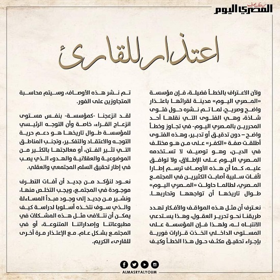 وأثار نشر الفتوى وعنوانها جدلا واسعا على مواقع التواصل الاجتماعي، وأصدرت جريدة المصري اليوم بيانا تعتذر فيه عن الخطأ في نشر الفتوى.